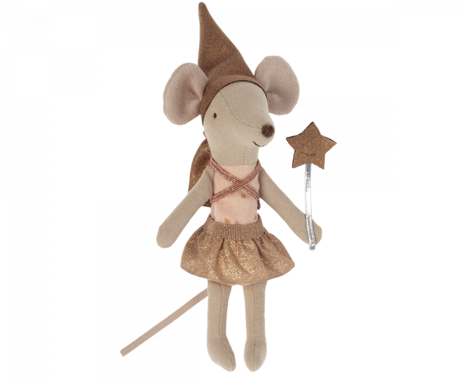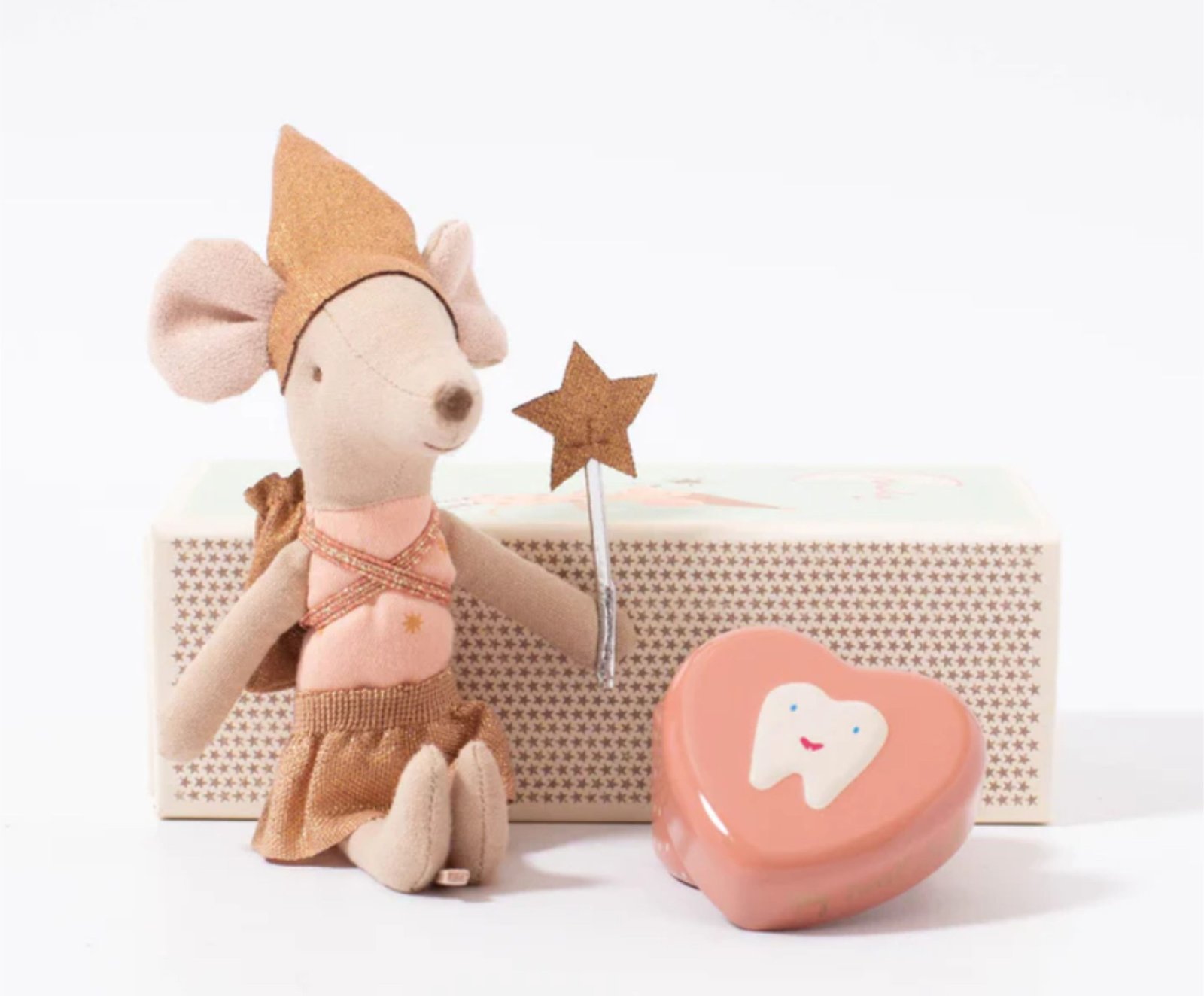 Naktimis dantukų fėja ieško vaikučių dantukų, spinduliuoja gėriu, suteikia grožį ir užtikrina, kad mažylių miegas būtų saldus. Fėja pasipuošusi aukso sijonuku, blizgia kuprine ir kepuryte. Į komplektuką įeina ir dėžutė pirmajam dantukui.