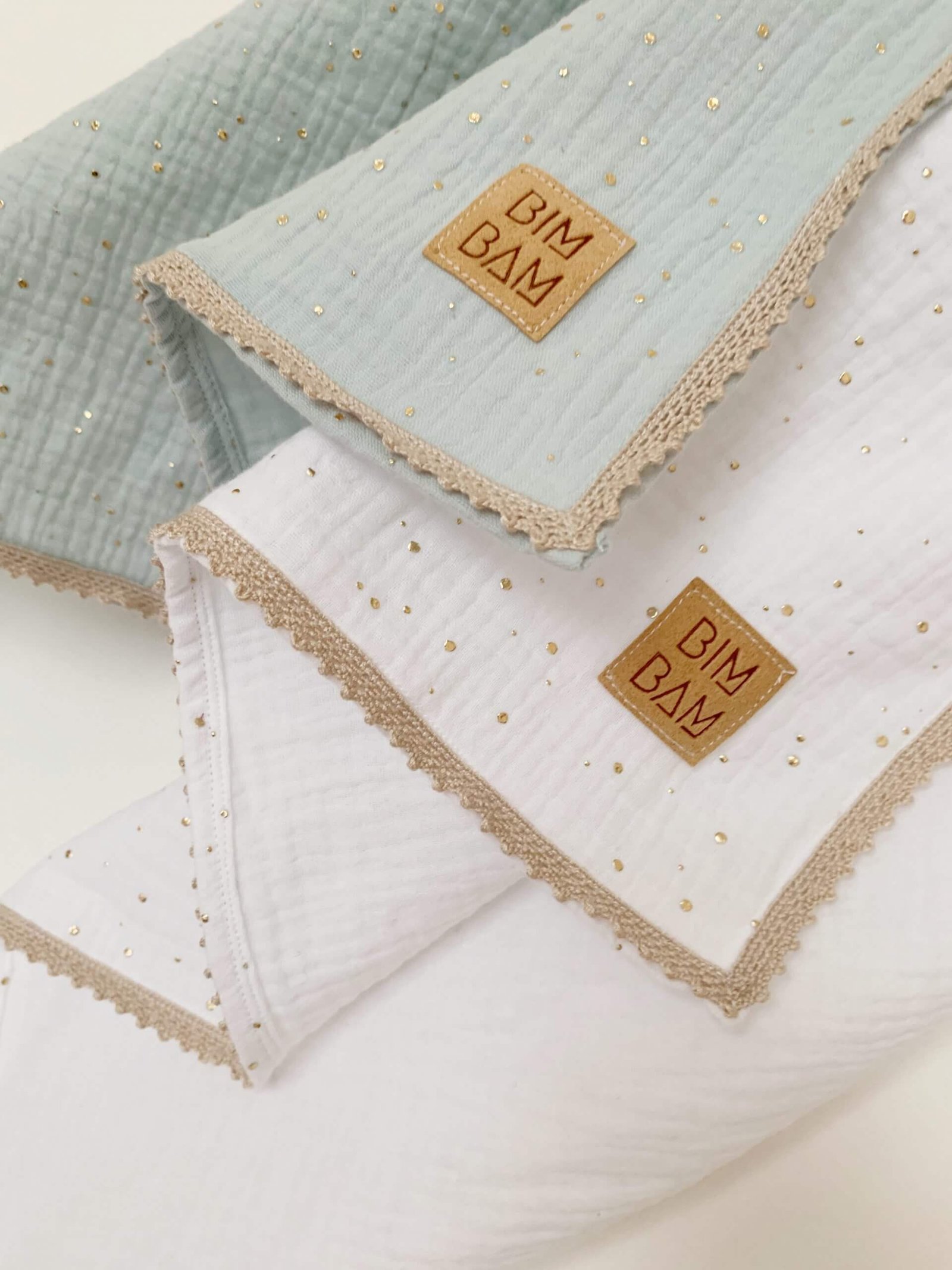 LUXURY viengubi dvigubo muslino daugiafunkciniai užklotukai su nėriniu per visą perimetrą.